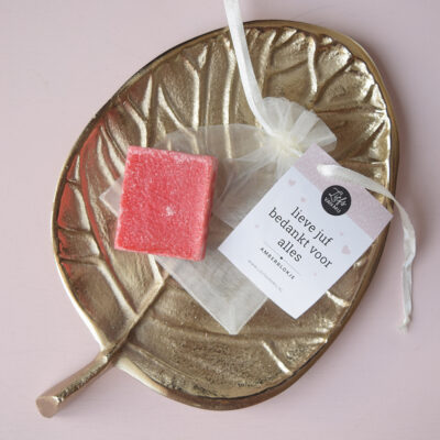 Amberblokjes in mooi ecru geschenkzakje voor de liefste juf. Amberblokjes zijn handgemaakte geurblokjes, afkomstig uit Marokko. Je kunt de amberblokjes gebruiken als huisparfum/luchtverfrisser. Neemt de geur af? Dan kun je met raspje makkelijk wat van het amberblokje afschrapen zodat het blokje weer heerlijk gaat ruiken. Het schraapsel kan je eventueel in een geurbrander of in de stofzuigerzak doen zodat de geur heerlijk door het huis verspreidt. Op deze manier kun je lang genieten van je geurblokje.