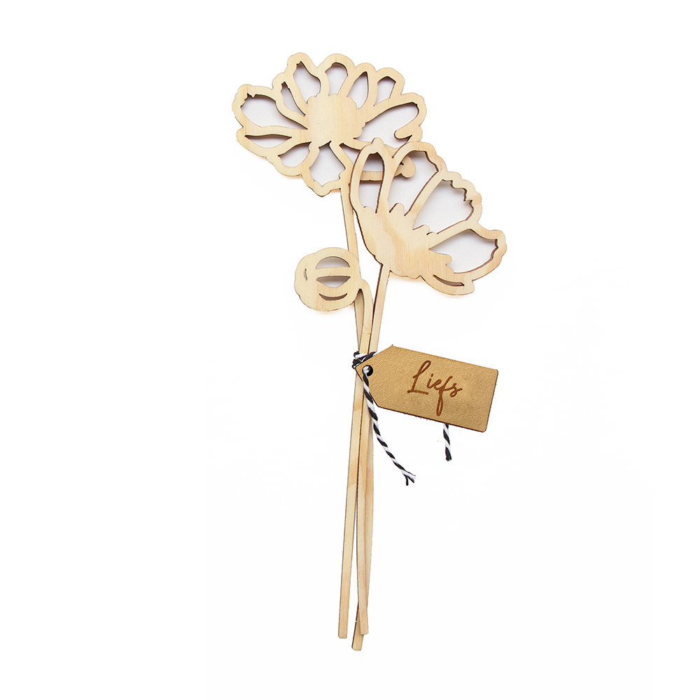 Verras iemand met een mooi boeketje houten bloemen. En weet je wat leuk is…deze bloemen zullen nooit verwelken en staan ook nog eens leuk in je interieur. Om het boeketje bloemen zit een leren label met ‘Liefs’ erop gegraveerd.