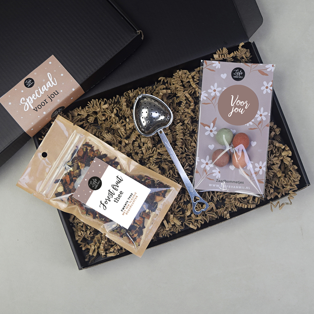 Verras je moeder, collega, zus of vriendin met een persoonlijke Liefs van mij brievenbus cadeaubox! Deze mooie zwarte cadeaubox past door de brievenbus. Je kunt een bijpassende kaart kiezen en wij schrijven jouw persoonlijke boodschap met de hand op het kaartje. De brievenbus cadeaubox wordt gesloten met een vrolijke sticker met de tekst ‘Speciaal voor jou’. Op de zwarte brievenbusdoos plakken we het verzendetiket en sturen deze rechtstreeks naar de ontvanger.