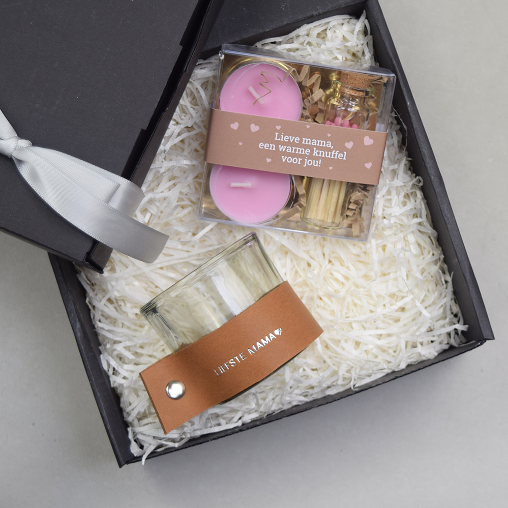 • Geschenkverpakking met twee theelichtjes en roze lucifers in flesje