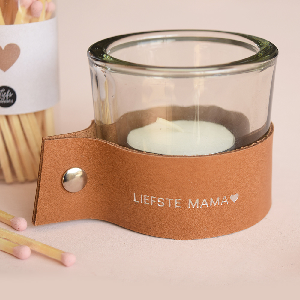 • Theehouder van glas met leren bandje met in zilverfolie ‘liefste mama’