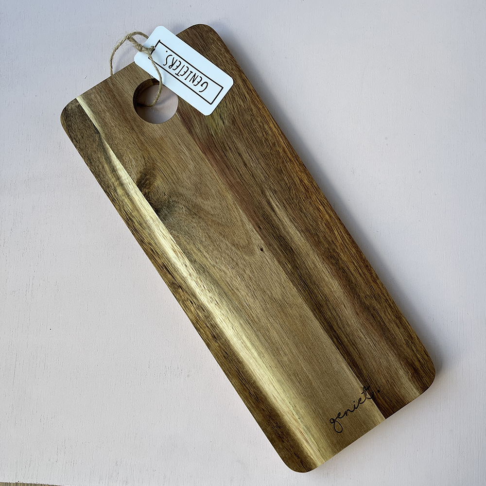 Hout is een natuurproduct waardoor de structuur en kleur per serveerplank kan verschillen. Elk plankje is uniek. Dus je krijgt precies het serveerplankje welke op de foto staat zodat je niet voor verrassingen komt te staan. In de serveerplank is de tekst Geniet! gebrand.
