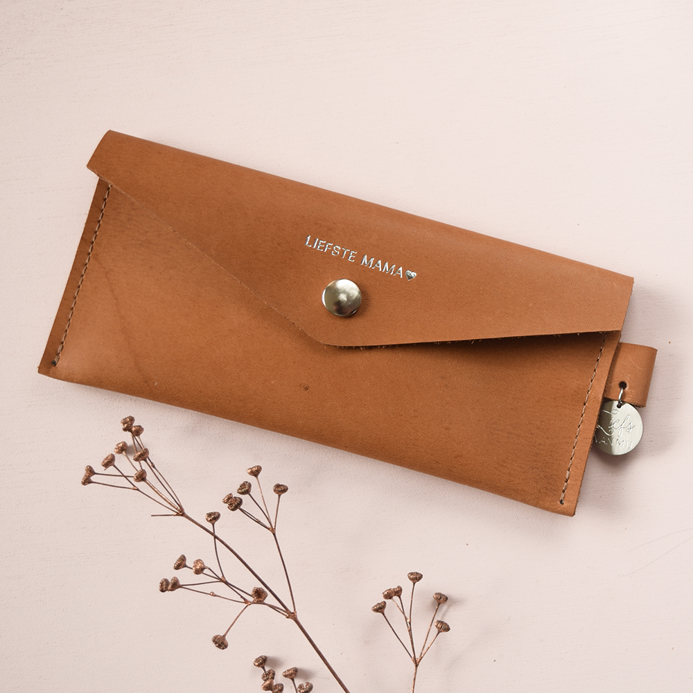 Ook altijd je mascara of lipstick kwijt in je tas? Of regelmatig opzoek naar pennen in je tas? Met het ‘Liefs van mij’ etui is dit verleden tijd. Het heeft ruimte voor al je losse pennen en make-up spullen. Het etui sluit met een drukknoop. Aan de zijkant hangt een RVS bedeltje met ‘Liefs van mij’ erop. Het etui is handgemaakt van 100% echt leder. Inclusief bedrukking zilverfolie tekst ‘liefste mama’