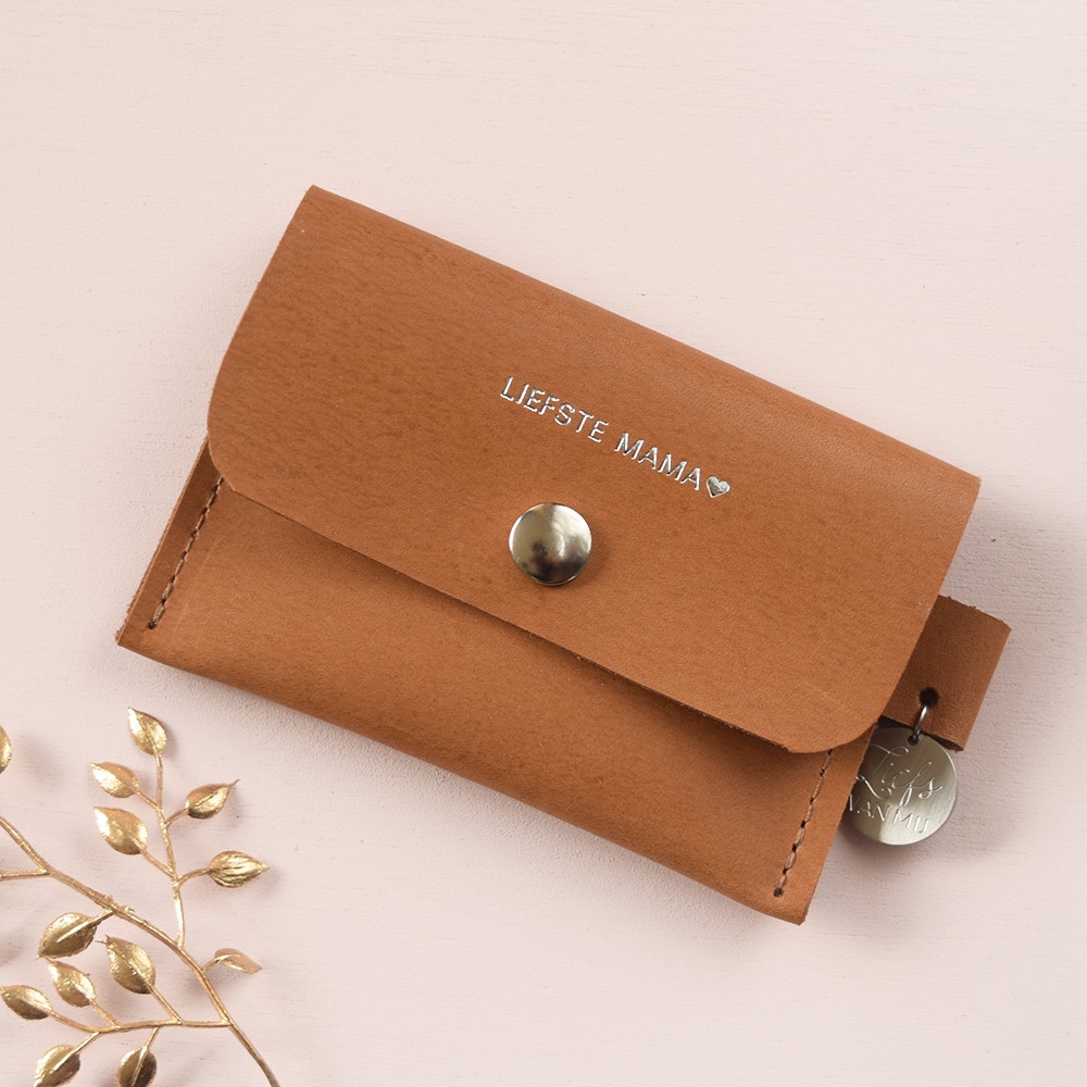 Een handige kleine portemonnee handgemaakt van 100% echt leder. De portemonnee sluit met een drukker en heeft twee vakjes voor pasjes of (brief)geld. De portemonnee heeft aan de zijkant een RVS bedeltje hangen met ‘Liefs van mij’ erop. Inclusief bedrukking in zilverfolie ‘Liefste mama’